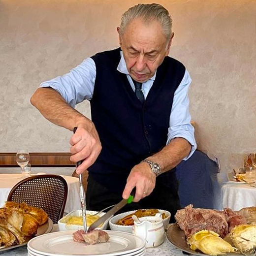 Sicuramente la forza della tradizione del nostro Ristorante è il carrello di arrosti e bolliti: prosciutto al forno, punta di vitello, polpettone agli amaretti, pollo alla diavola, manzo, lingua, testina e cotechino, gallina bollita il tutto accompagnato da una dovizia di verdure che seguono il corso delle stagioni puntarelle con acciughe, cippollotti in agrodolce, patate con prezzemolo, carciofi olio e limone, salsa verde, mostarda di frutta e di verdura.